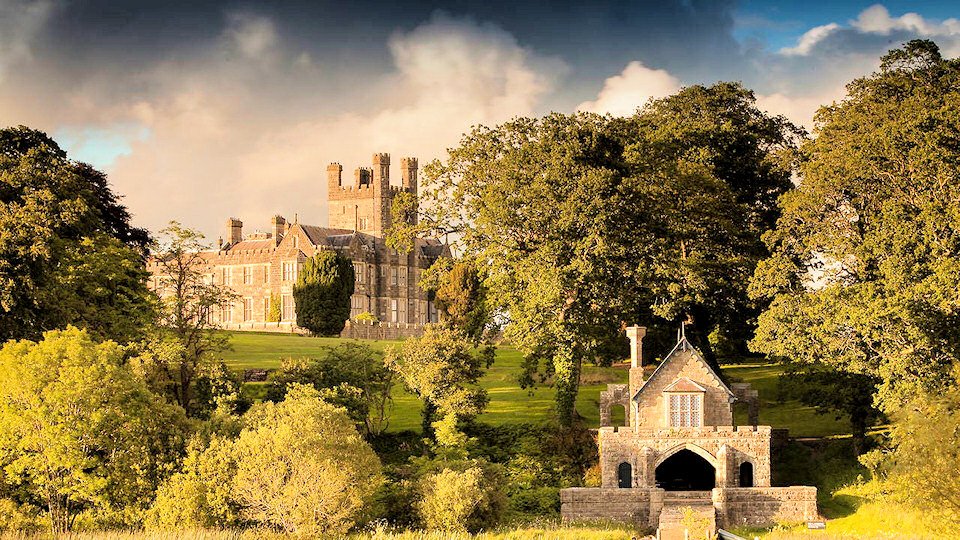 Crom castle. Crom castle can be found nestled along the banks of the Lough Erne in County Fermanagh in Northern Ireland. The estate in which the castle is set is measured as being approximately 1,900 acres. Like many of the grand estates which can be found within the county of Ulster, the house at Crom was erected by a Scottish planter just towards the end of the 1600s. In the year 1611, as part of the plantation of Ulster, Michael Balfour, the Laird of Mountwhinney, constructed a house on the Lough shore opposite Inishfendra Island. Following the usual pattern for a plantation castle, The old castle at Crom was built of lime and stone and was enclosed within a bawn.